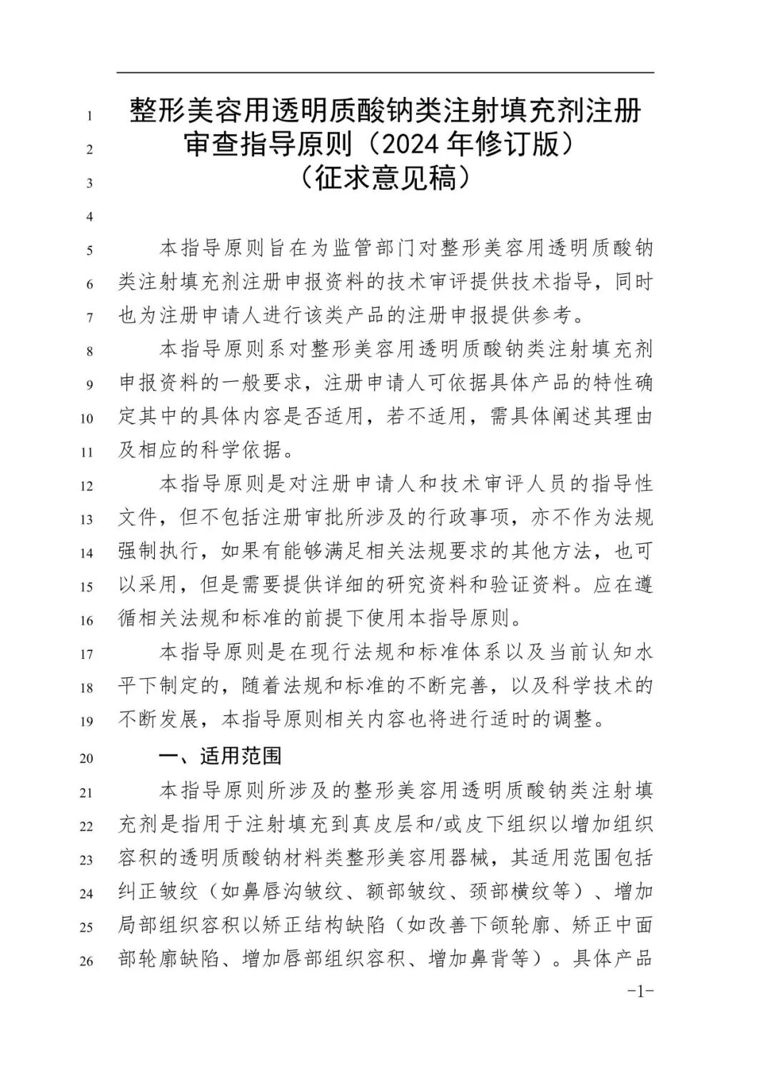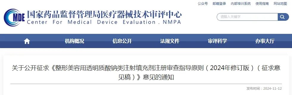 CMDE | 關于公開征求《整形美容用透明質酸鈉類注射填充劑注冊審查指導原則(2024年修訂版)(征求意見稿)》意見的通知